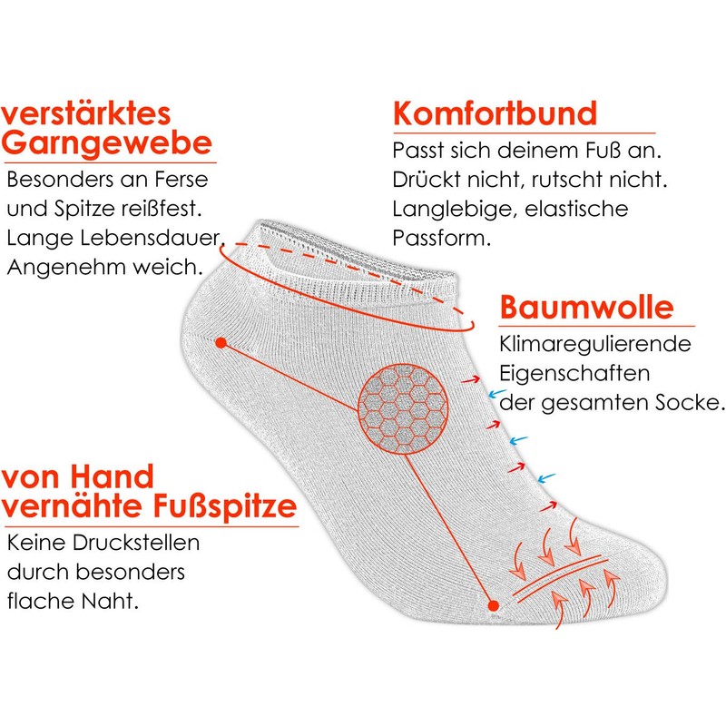 - 75% cotton ensures a comfortable and soft feel. Thanks to the balanced proportion of elastane, the trainer socks are pleasantly stretchy and lie slightly on the foot, but do not slip.