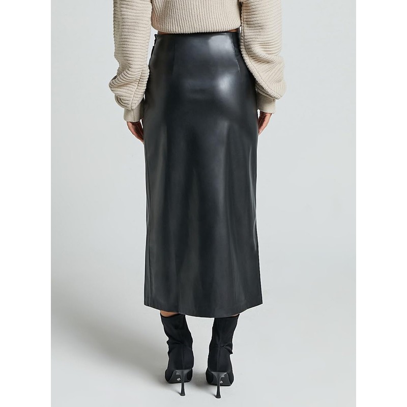 RSBFK Women's High Waist Faux Leather Side Slit Bodycon Fit Long Midi Skirt, black