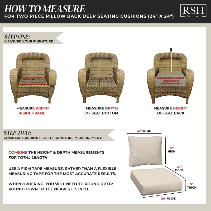 - SIZE SPECIFICATIONS – Our 4" thick seat cushion measures 24” x 24" and the pillow back is 24" x 20". To ensure the best fit, measure your seat between the arms and from the base of the back to the top of the chair. Subtract 4” from the back measurements to account for the seat cushion. NOTE: foam seat cushion may not fit properly in curved seating.