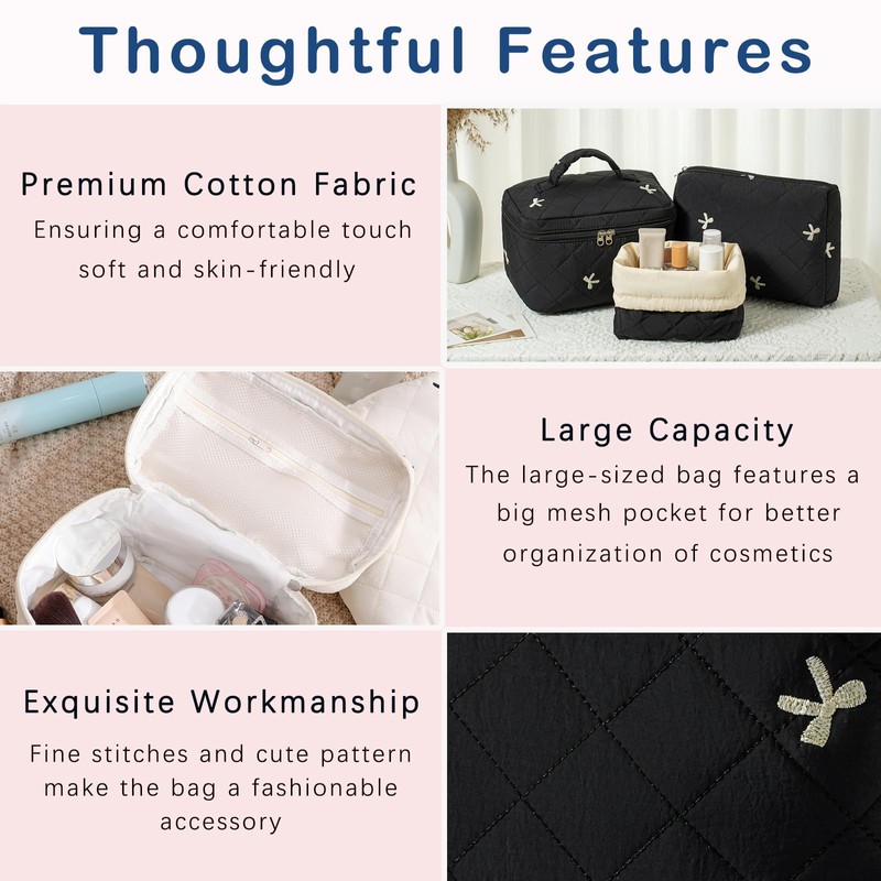 RSRSLEII 3Pcs Aesthetic Cotton Quilted Drawstring Makeup Bag Set, Aesthetic Cute Bow Makeup Pouch for Girls and Women, Aesthetic Travel Organized Cosmetic Bags for Purse(05Black Bow)