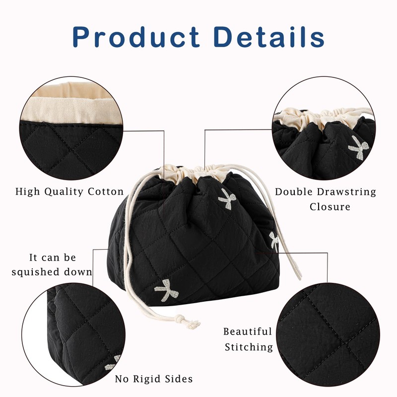 RSRSLEII Small Cotton Quilted Drawstring Makeup Bag, Cute Coquette Drawstring Cosmetic Bag with Canvas Lining, Aesthetic Travel Organized Toiletry Bags for Purse (Drawstring Blackbow)