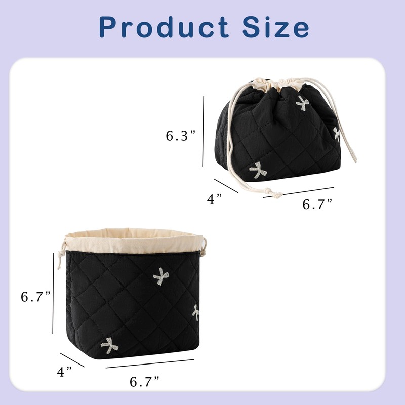1. The quilted cute drawstring Makeup Bag are: 6.7inches x6.7 inches x 4 inches. Mini pouches size are 5.7inches x5.7 inches x 2 inche.