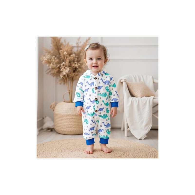 - Design:Long sleeve hooded romper, animal themed baby fleece jumpsuit, thoughtful design dinosaur / elephant / butterfly / heart / football / soccer / dot / flower / footprint printing jumpsuit, button down closure, convenient to put on/off or change diapers, wind-proof baby outfits winter