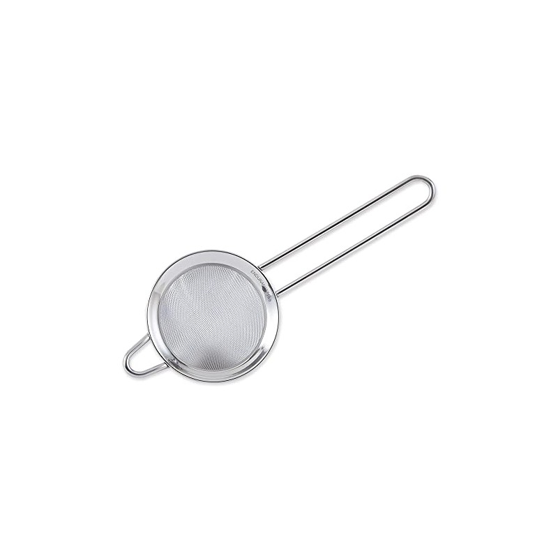 - Extra fine mesh cone shaped strainer with polished rim and handle