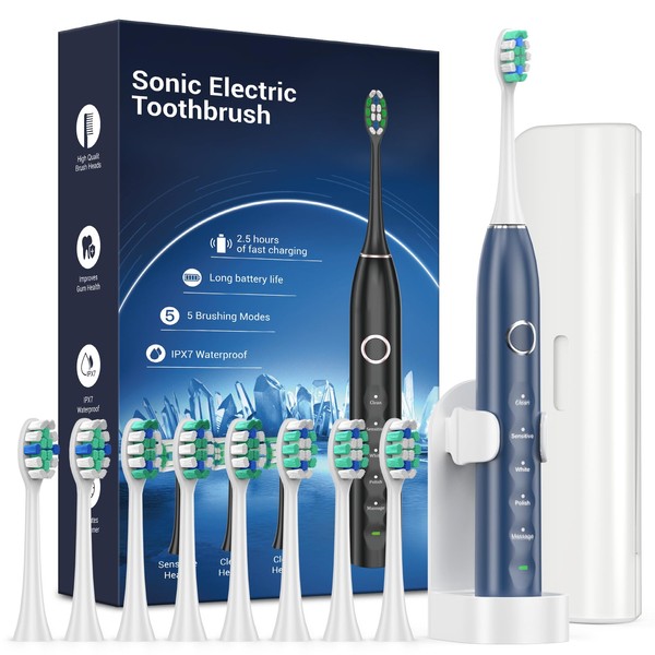 Rtauys Rtauys S5 Electric Toothbrush Set IPX7 with 8 Brush Heads, Sonic Toothbrush for Adults Rechargeable with Travel Case, 2.5 Hours Charge for 120 Days, 5 Modes with 2 Minutes Built in Smart Timer Blue