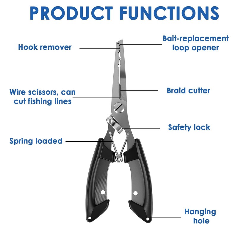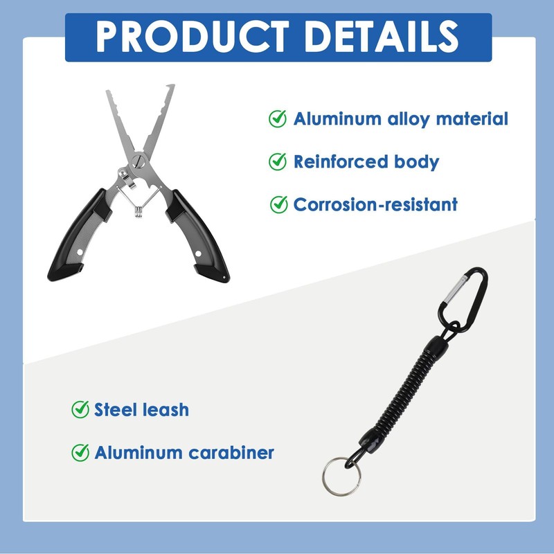 - Safety Coiled Lanyard & Secure Locking: Comes equipped with a practical steel leash featuring a sturdy aluminum carabiner, enabling quick attachment to belts, tackle boxes, or life vests to keep your essential tool always within reach and prevent accidental loss overboard. The integrated locking block effortlessly snaps into place to securely fasten the plier jaws closed during transport or storage, protecting the edges