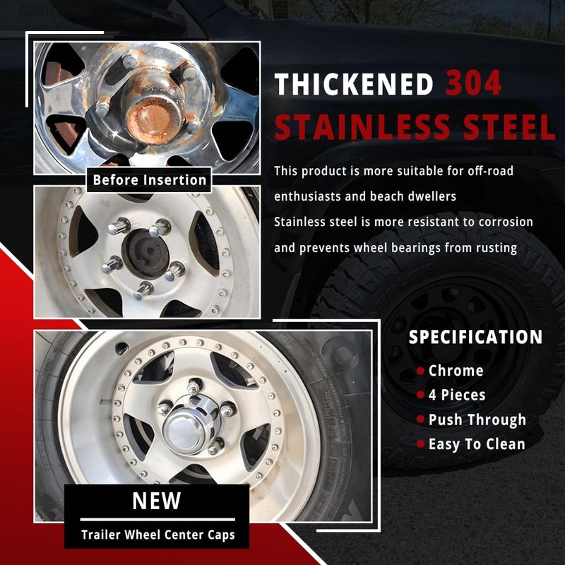 - Material: stainless steel trailer wheel center caps with aluminum badge