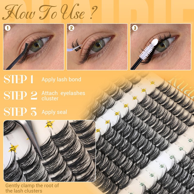 - 4.Natural Curvature Individual Eyelashes Extensions: C-curly eyelash clusters feature a curvature that fits perfectly with natural lashes, offering strong root support and a light tip. Our lash clusters stay lifted throughout the day without collapsing, ensuring a comfortable cluster lash extensions wearing experience with no discomfort.