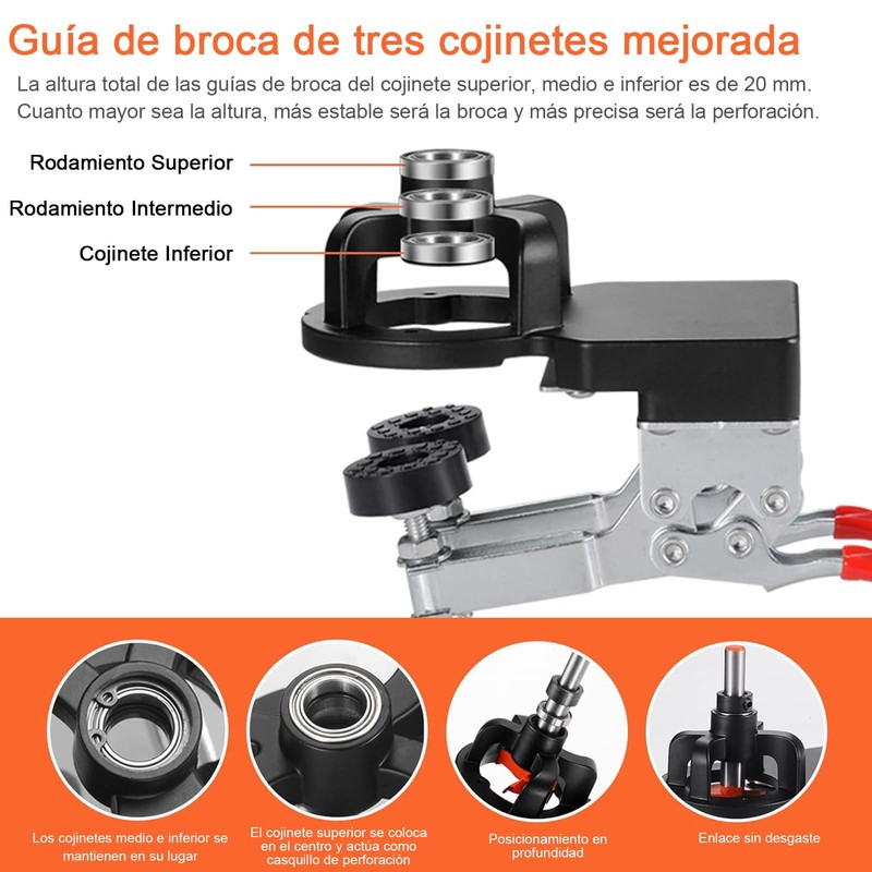 - Guías de broca de tres cojinetes mejoradas: guías de broca con cojinetes superior, medio e inferior. La altura total de la guía de broca es de 2 cm. La broca tiene un rango de giro pequeño y una apertura precisa del orificio.