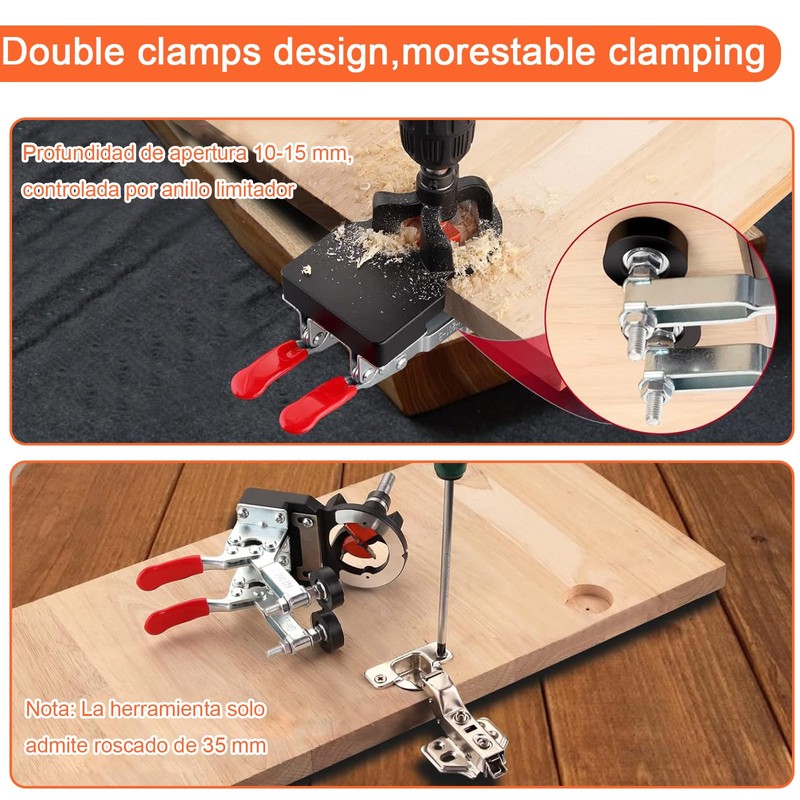 - Diseño de madera contrachapada doble ajustable: la madera contrachapada doble ajustable tiene un posicionamiento preciso y puede sujetar tablas de madera con un espesor de 15-25 mm, lo que facilita perforar agujeros en múltiples ángulos rápidamente e instalar bisagras de puertas de gabinetes.