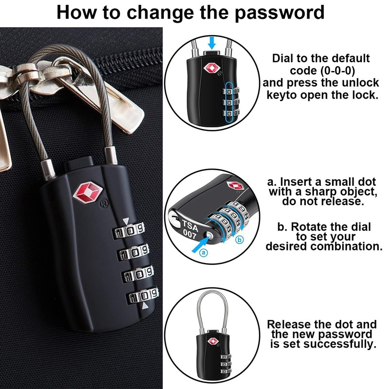 - High-quality materials: the lock is made of durable die-cast zinc, the cable is made of shatterproof, cut resistant steel. Can only be opened with the correct code or the TSA key - perfect protection for your luggage!