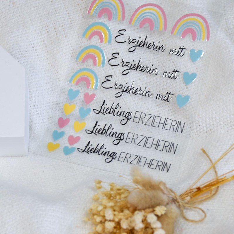 Rub-On Sticker "Erzieherin mit Herz" pastell Regenbogen A6 RANDLOS | geeignet für Raysin, Keraflott oder Glas | Rub Ons Aufkleber zum Basteln und Dekorieren | für Selbstbedienungshäuschen