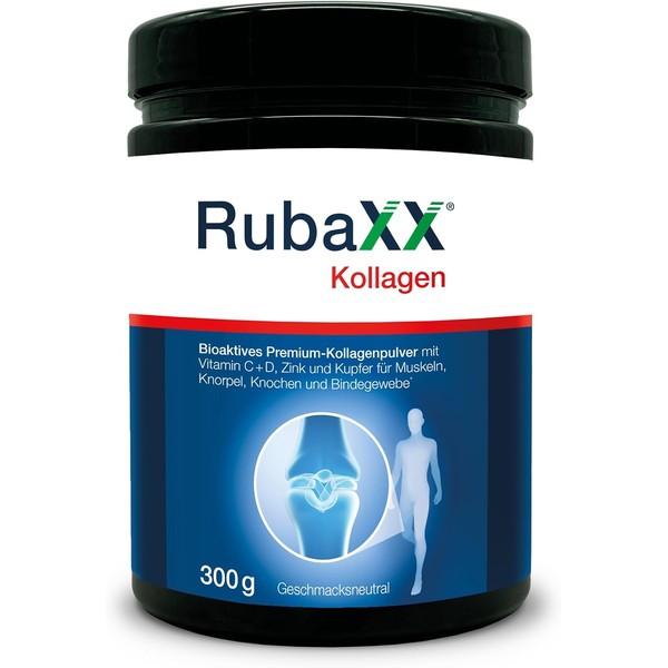 MORE PRODUCT INFORMATION Collagen is far more than just a simple protein in our body, it forms the framework for different types of tissues, including the joints. In terms of our joints, collagen plays a crucial role in building cartilage tissue, which acts as a shock absorber between the bones, protecting the joints from friction and wear. In addition, collagen fibers are an important component of tendons and ligaments that stabilise the joints while allowing flexible movements. With age, the body's own collagen production naturally decreases - a process that can be further accelerated by excessive stress or an unhealthy lifestyle. The result may be a collagen deficiency that affects the health of the joints and connective tissue. RubaXX collagen was developed by the joint specialists of the RubaXX® brand, which stands for the highest expertise in muscle and joint health in pharmacy quality. *Vitamin C contributes to normal collagen formation for normal functioning of blood vessels, skin, bones and cartilage, zinc contributes to the maintenance of normal bones, vitamin D contributes to the maintenance of normal muscle function, copper contributes to the maintenance of normal connective tissue. Suggested dose/instructions for use: daily stir one serving spoon (= 10 g) into water, tea, coffee, smoothies or soups. Do not exceed the recommended daily dose. Ingredients: 99.8% Sologell™ collagen hydrolysate (beef), L-ascorbic acid, zinc picolinate, copper gluconate, cholecalciferol, D-biotin.