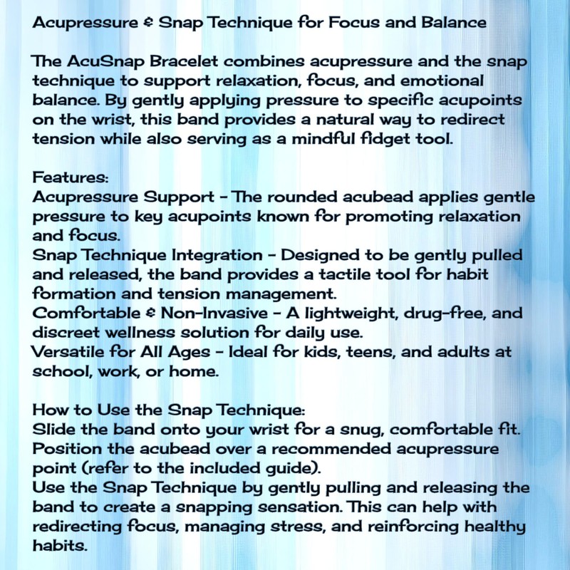 - Snap Technique for Focus – Simply pull and snap the band on your wrist to help redirect your attention and support behavior modification.