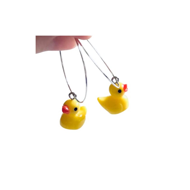 - Resin Duck charms on silver alloy soft hoops earrings