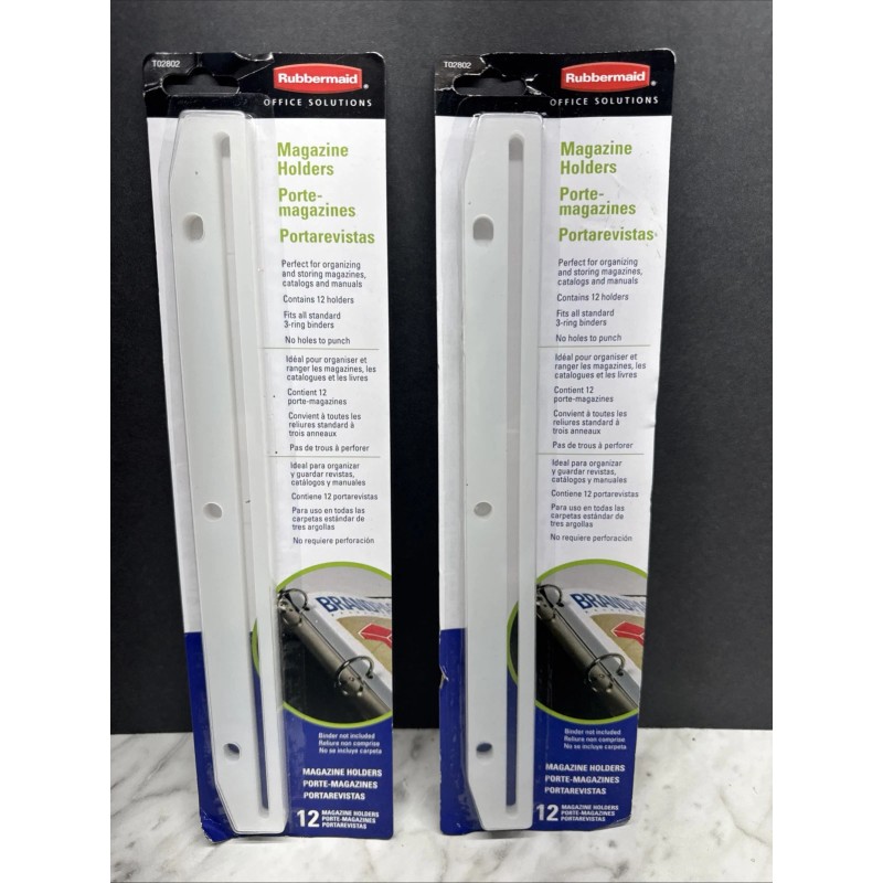The product is a set of two Rubbermaid 3-hole plastic magazine holders designed for 3-ring binders. Each set includes 12 holders in an open package. These magazine holders are made of plastic, with a width of 3.49 inches, manufactured by Rubbermaid. They are ideal for organizing and storing documents or magazines within a 3-ring binder.