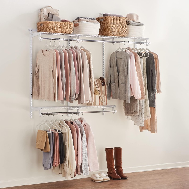 - Telescoping rods and expanding shelves adjust to add 12 ft. of shelving space and 10 ft. of hanging space