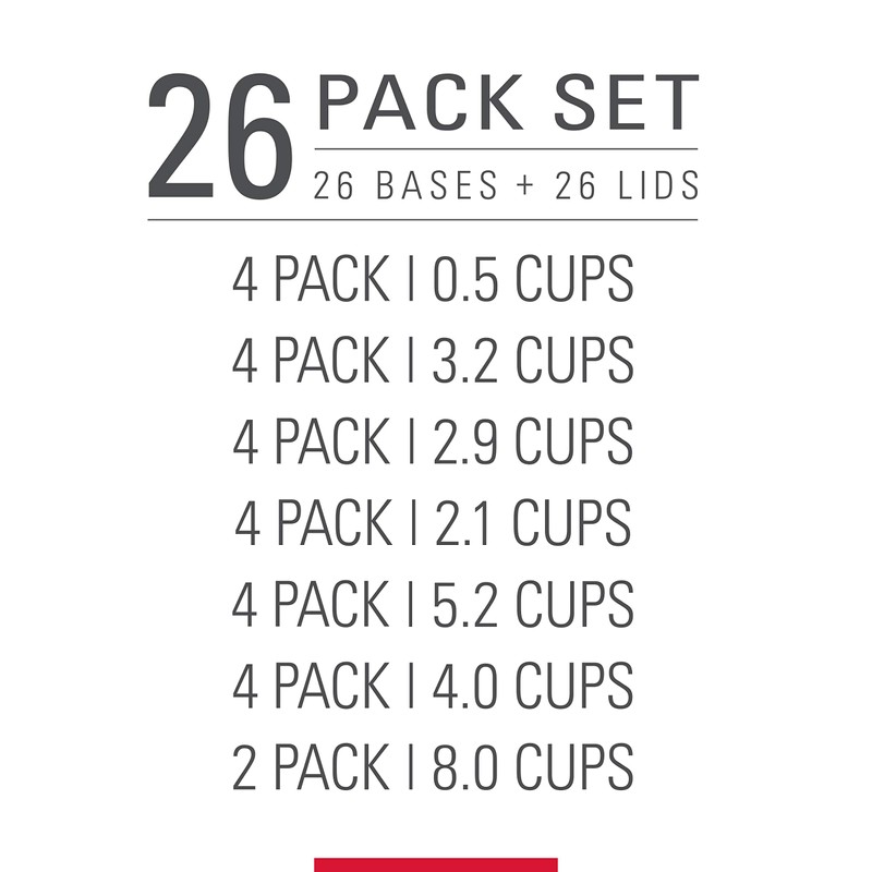 - Set contains four 0. 5-cup, four 3. 2-cup, four 2. 1-cup, four 2. 9-cup, four 5. 2-cup, four 4-cup, and two 8-cup containers, plus lids, for a total of 52 pieces