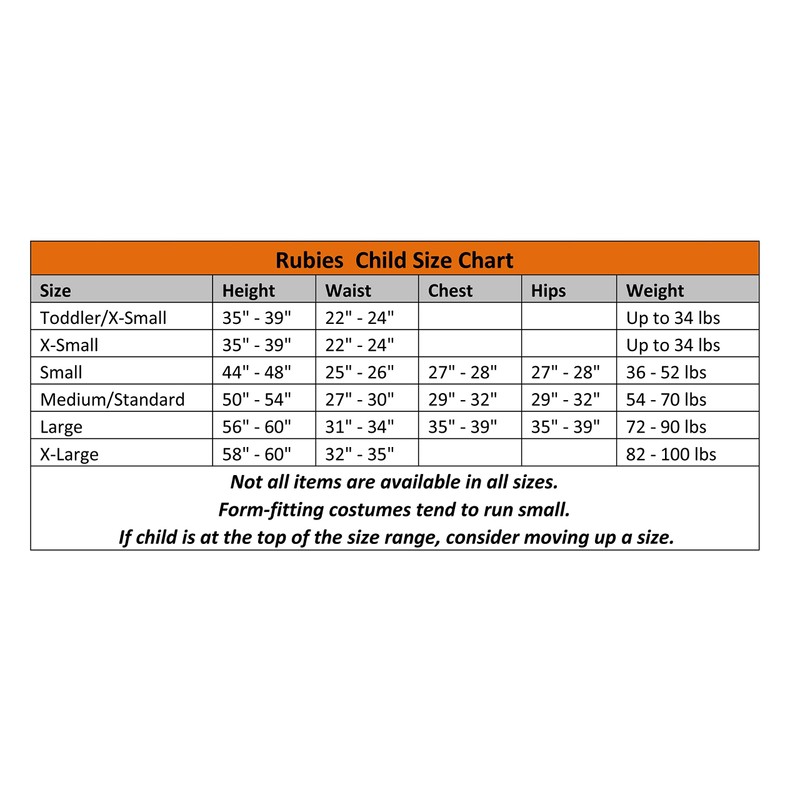 • Important: Costumes are sized differently than apparel, use the Rubie's Child Size Chart, do not choose based on child's age or clothing size
