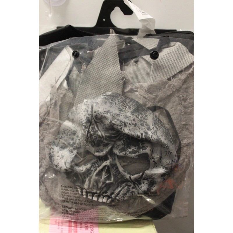 This Messenger of Death costume is a complete costume, great for scary Halloween fun! The costume includes a long, black robe with long, flowing sleeves, and a rope belt goes around the waist. A gray hood goes over the shoulders and head. Large gray wings are worn on the back. A pair of black gloves go on the hands so skin is not exposed on the arms. The costume is finished with a half face mask.