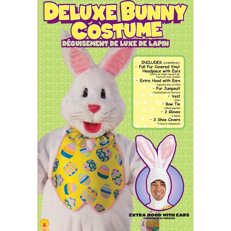 - Deluxe Mascot quality Bunny costume features large, plush body with vibrant yellow vest and matching bow-tie