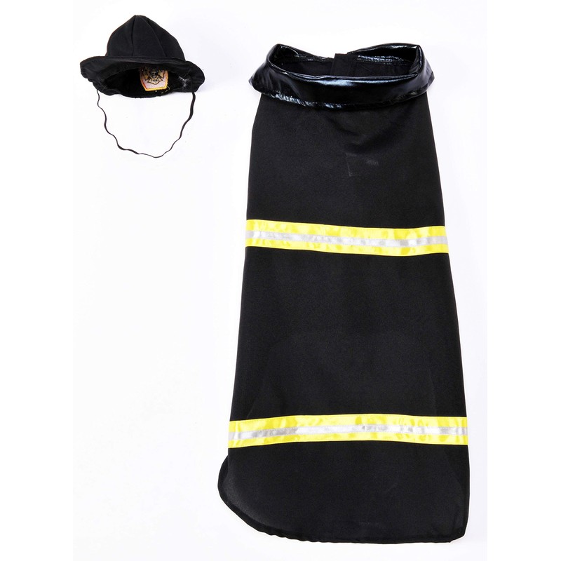 - Firefighter pet costume includes jacket with reflective stripes and matching hat