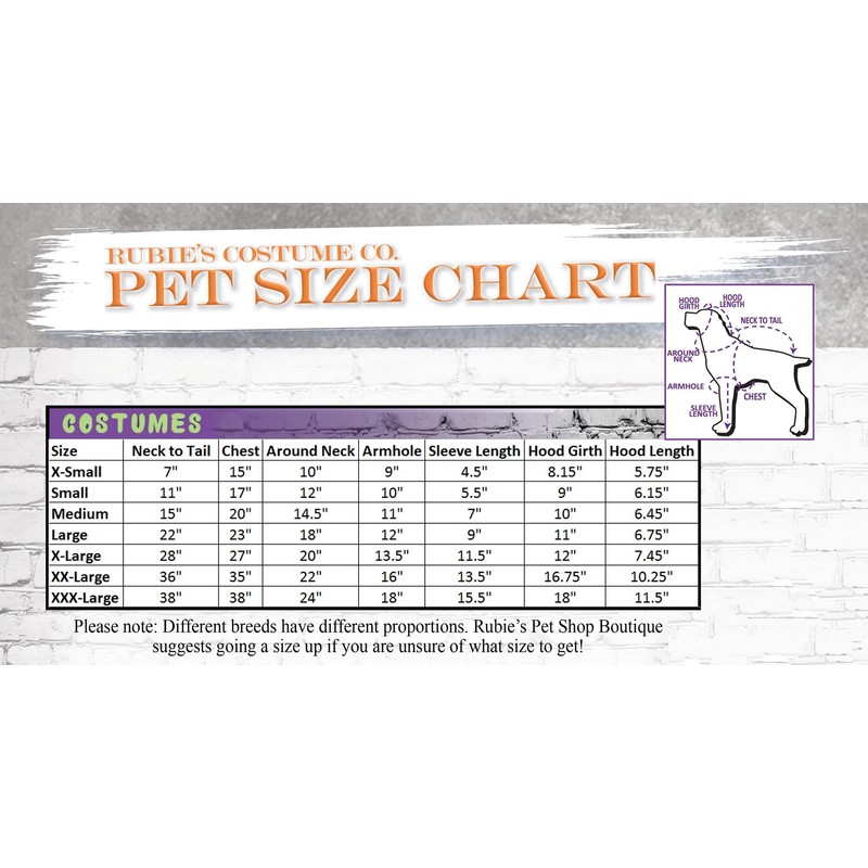 - READ THE RUBIE’S PET SIZE CHART and WATCH THE SIZING INSTRUCTION VIDEO, do not select size based on breed; consider costume style and animal shape before ordering