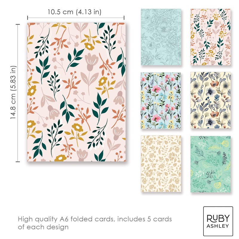 Ruby Ashley Blank Cards and Envelopes. Pack of 30 Notelets and Envelopes Set. Multipack Floral Blank Greetings Cards And Envelopes Box Set For Adults and Kids Made in the UK