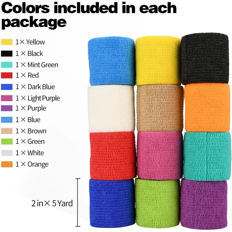- 【12pcs 2in Bandage】- Self adhesive bandage wrap set includes 12 pack self adhesive bandage wraps whose size are 2in × 5 Yards, 12 colors can match your different daily wear and can make your exercise less monotonous and more enjoyable.