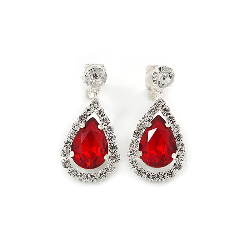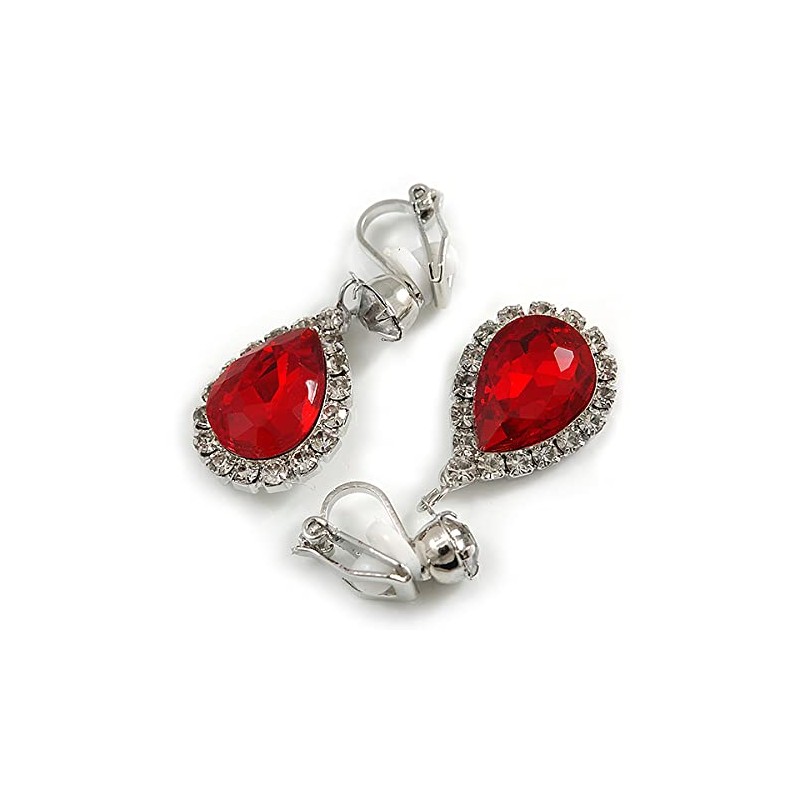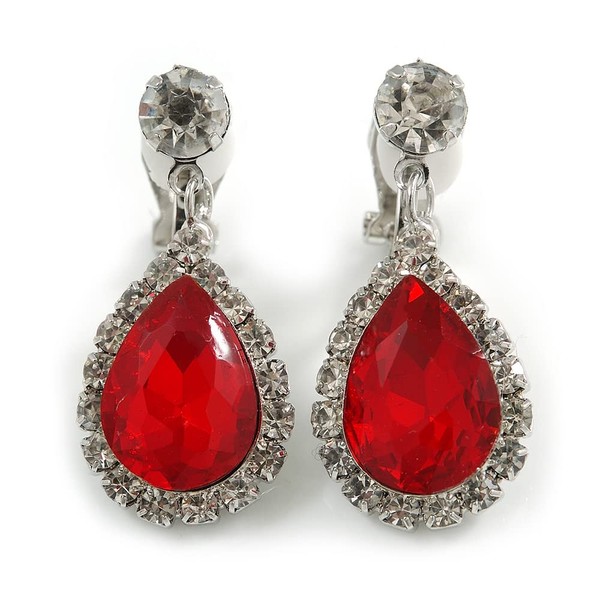 Ruby Red/Clear Crystal Teardrop Clip On Earrings In Silver Tone Metal - 33mm L