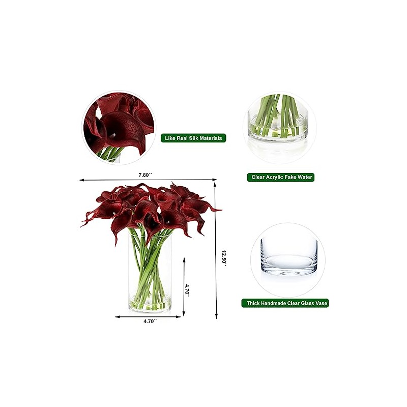 - 【Dimension】Artificial flowers with fake water in glass vase with 20pcs large items real touch Calla Lilies flowers, approx 12.5H x 6W inches, cylinder glass vase 7.8H x 4W inches
