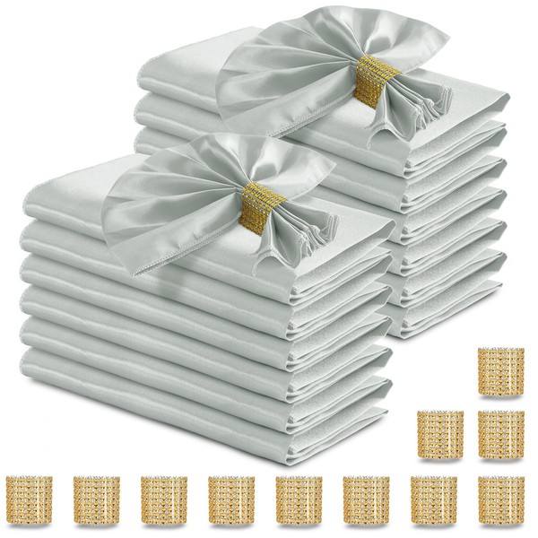 - Dinner Napkins Set: Set of 50, 50 pieces grey satin napkins in size 17 x 17 Inch, 50 pieces gold napkins rings. 50 sets of table napkins and plastic rhinestone napkin rings bulk meet various needs for party and banquet dinning table decorations.