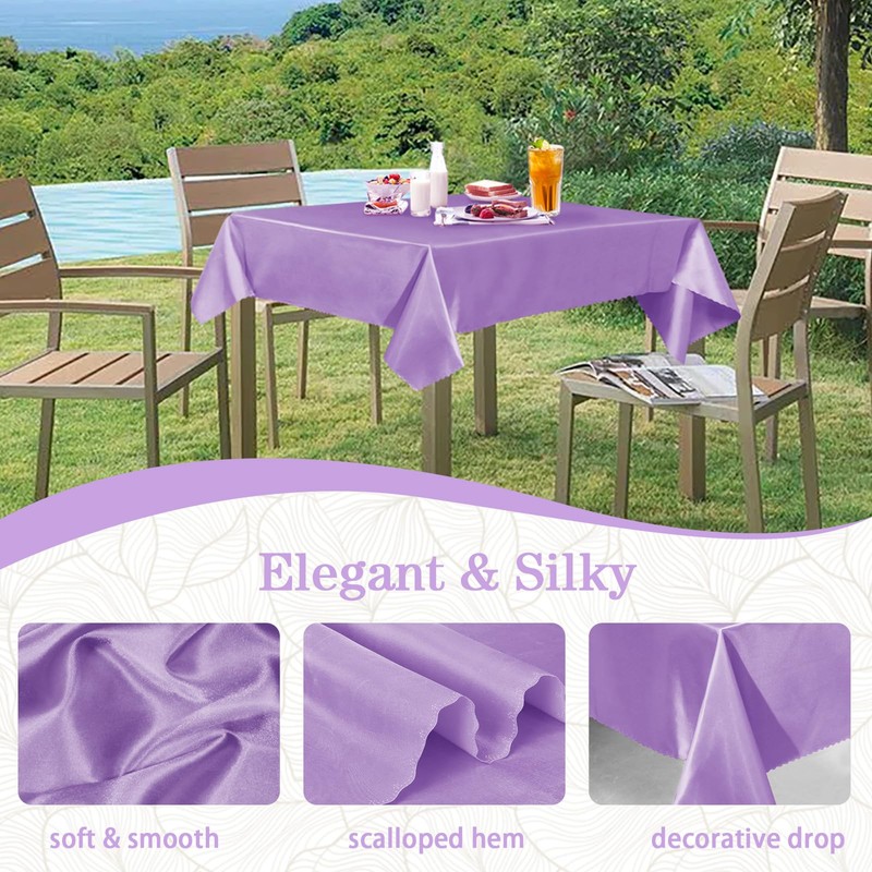 - Satin Square Table Cloth: You will get 2 pieces light purple square tablecloth in size 60 x 60 inch / 5ft x 5ft, which is available to decorate the square table for 4-6 persons around 36 inch with 12 inch drop to 40 inch with 10 inch drop.
