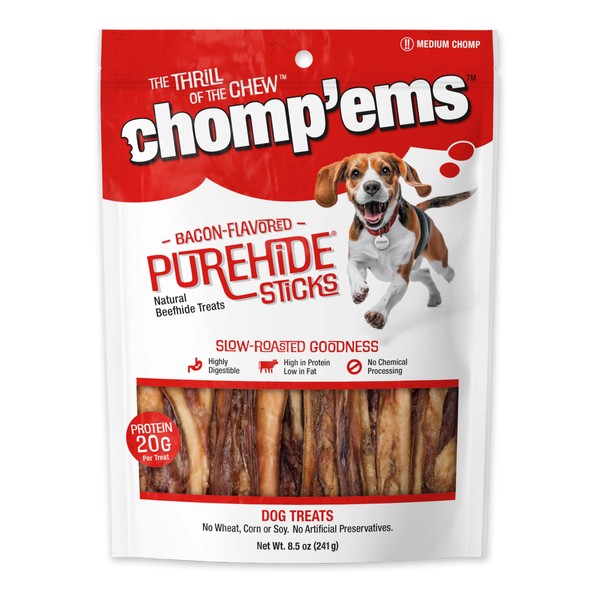 CHOMP 'EMS Purehide Chews - Slow Roasted Naturally Delicious Rawhide Dog Treats - High Protein Beef Hide - Bacon Flavor, Sticks, 8.5 Oz.