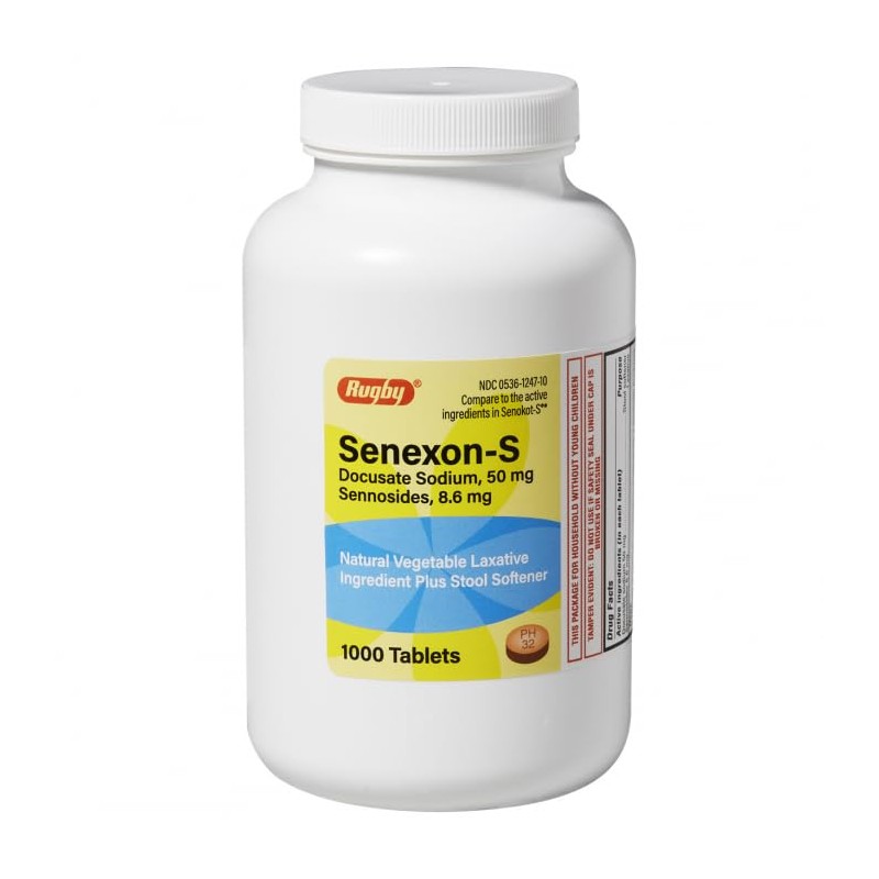 Rugby Senexon-S Natural Vegetable Laxative Plus Stool Softener - Docusate Sodium, 50 mg - Sennosides, 8.6 mg - 1000 Tablets