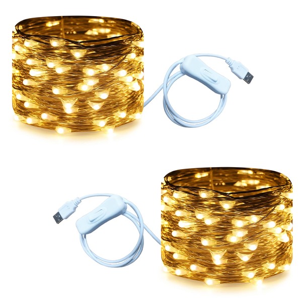RUICHEN USB Fairy Lights 33 Ft 100 LED String Lights with On/Off Switch (Warm White, 2 Pack)