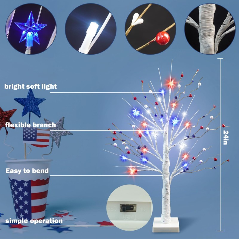 Ruidazon 24" 4th of July Decoration, Lighted Patriotic Tree with Red White Blue Star 24 LED Lights Timer Battery Operated Artificial Birch Table Tree for Flag Day Independence Day Centerpiece Decor