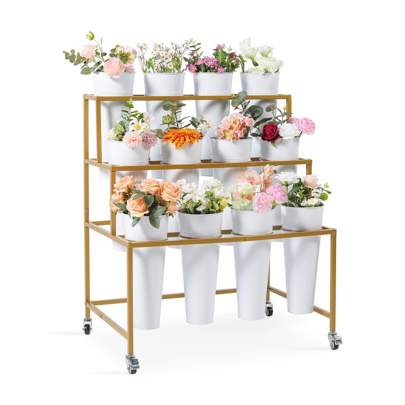 Ruifabo Flower Cart Display Stand, 3 Layers Metal Flower Bar Stand with 360° Swivel Wheels and Brake, Flower Display stand with Iron Buckets, Durable than Plastic Buckets, Flower Holder for Florist or Wedding