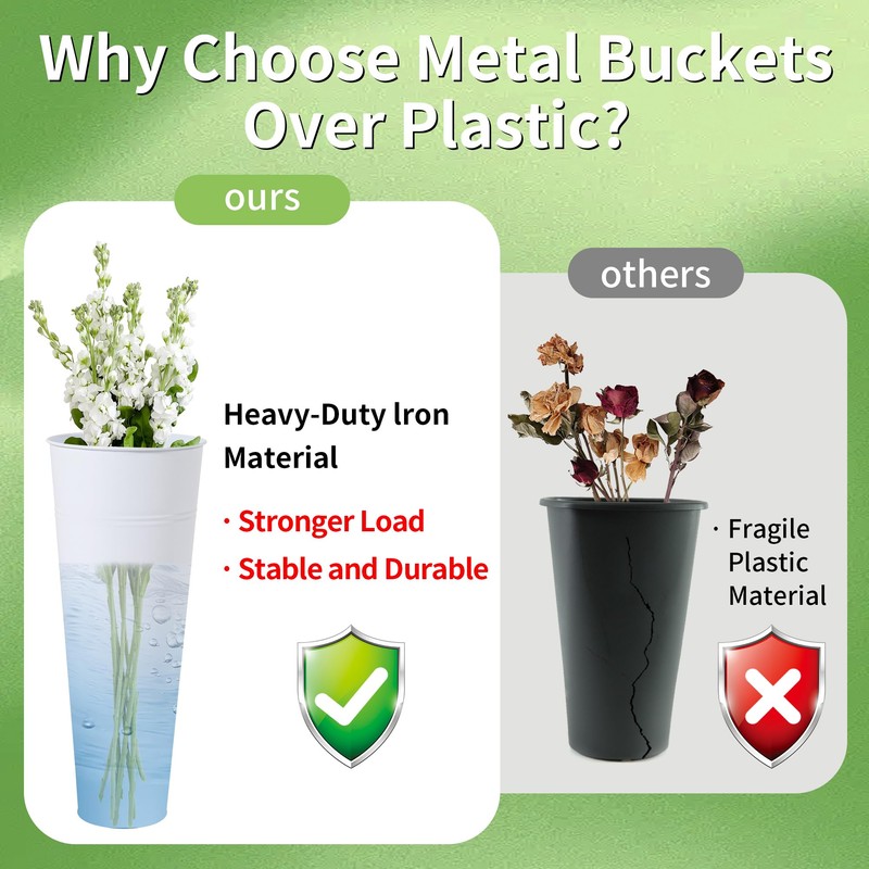 - 【Widely Used】12 Large capacity flower buckets have a glossy metal finish that complements your floral displays. They are ideal for displaying flowers at home, garden, florists, weddings, parties