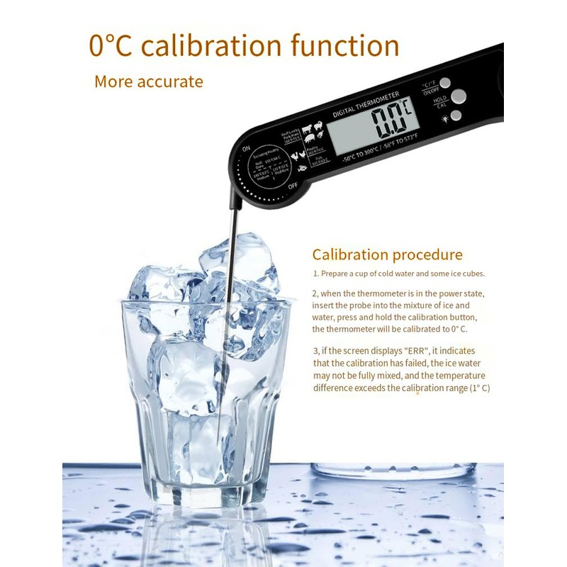 - [Effortless Lock & Calibration]A versatile digital meat thermometer for precise food temp measurement. Locks temp reading on display, safe viewing away from heat. Calibration function ensures unwavering accuracy of the instant-read probe at all times.