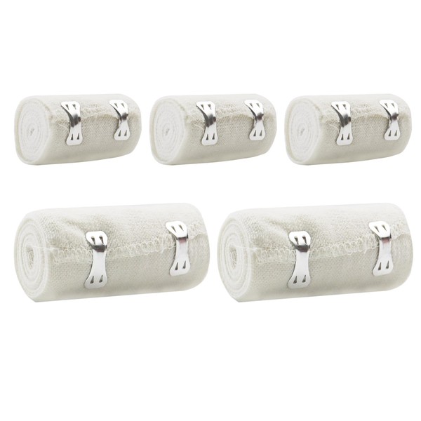 RUIJIE Elastic Gauze Bandages, 5 Rolls, Compression Bandages with Metal Clips, Elastic Bandages Wrap for Knees, Wrists for Sprain Injuries (2 Sizes)