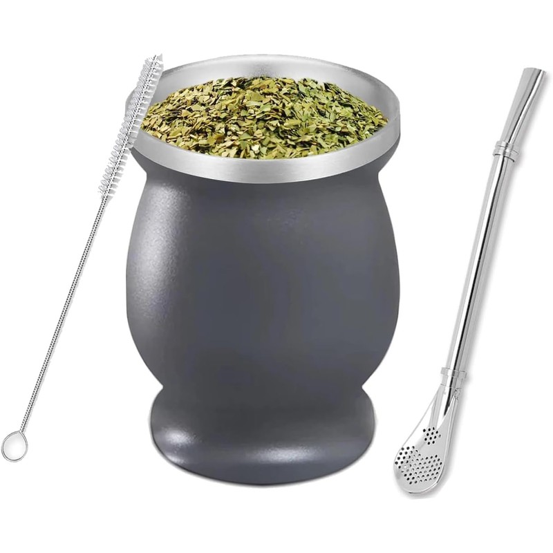 Ruikcoll Mate Tea Cup Set, Mate Cup, with Mate Straw and Cleaning Brush, for Mate Tea, Double Wall Insulated Design, Grey