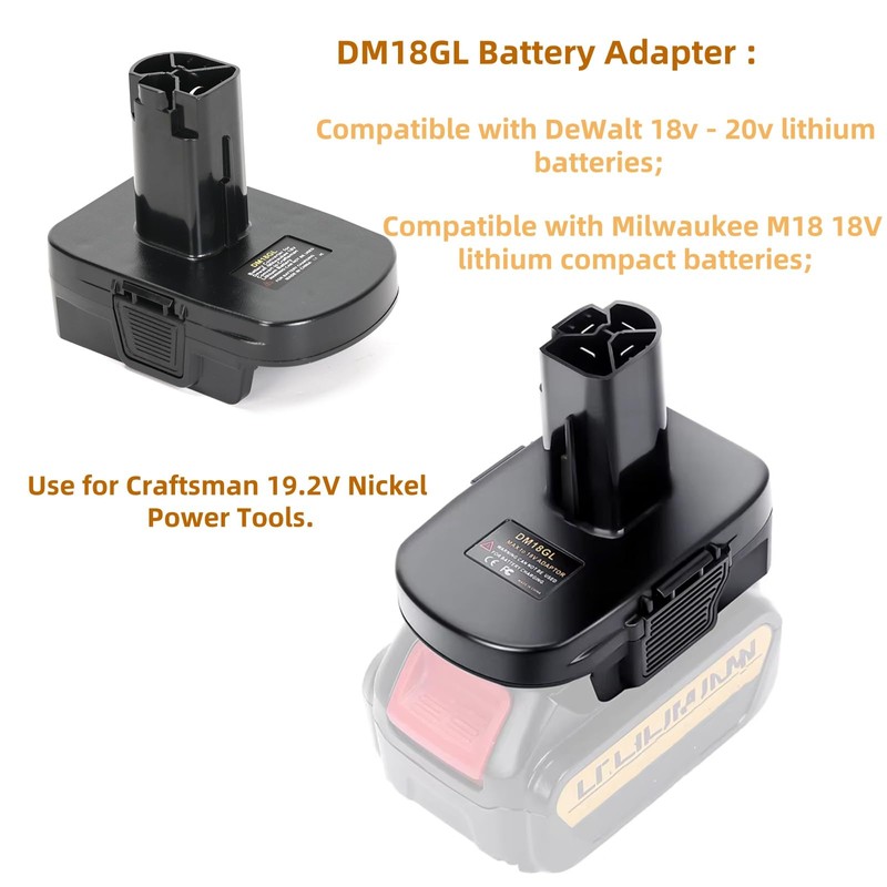 - 1.Compatibility: DM18GL Battery Adapter Compatible with dewalt 18v - 20v lithium batteries(DCB200, DCB201, DCB203, DCB203, DCB204, DCB205, DCB206 etc.); Compatible with Milwaukee M18 18V lithium compact batteries(11-1820, 11-1822, 11-1828, 11-1840, 11-1841, 11-1850 etc.); Convert them to Craftsman 19.2 volt lithium battery. Use for Craftsman 19.2V Nickel Power Tools.
