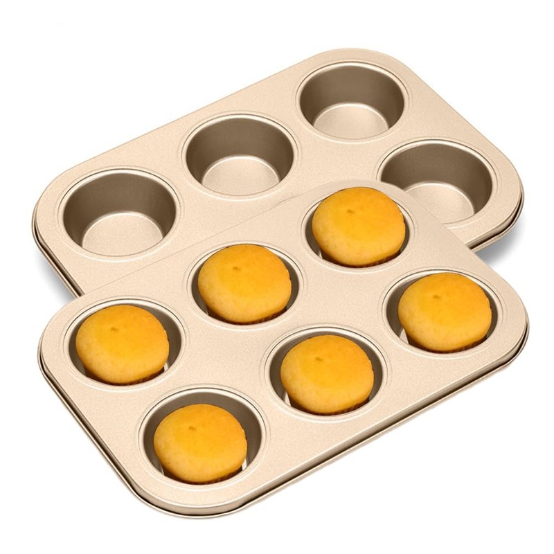 Ruioomeep Round Baking Tray for Muffins, Pack of 2, Carbon Steel Muffin Tray for 12 Muffins, Mini Muffins Baking Mould, 27.5 x 18.5 cm, Non-Stick Coating, Muffin Moulds, Mini Cupcake Moulds, Gold
