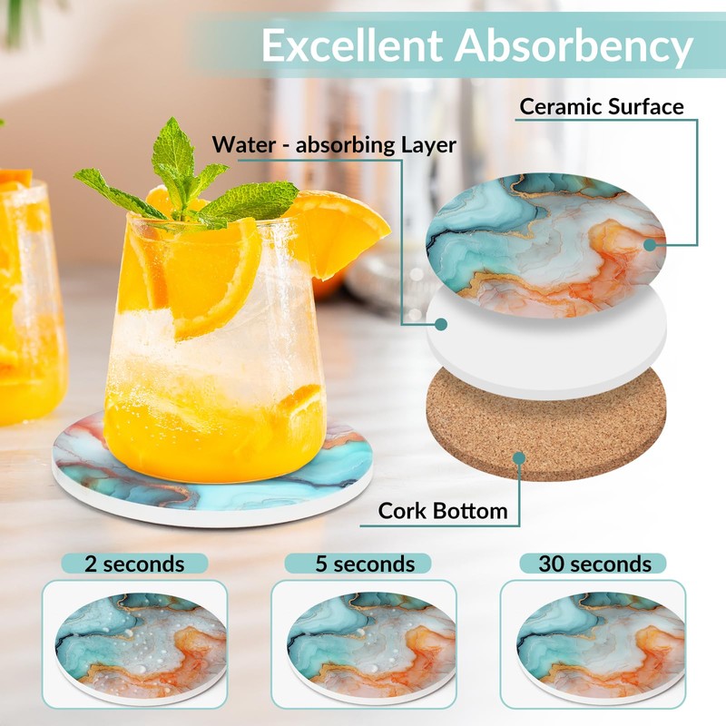 • 【Excellent Absorbency】: These absorbent coasters for drinks are absorbent, effectively preventing water rings and spills from wetting your table. It can not only absorb the water droplets sliding off the cup but also insulate heat, keeping the tabletop dry and the surface safe. This feature makes them highly suitable for both hot and cold beverages.