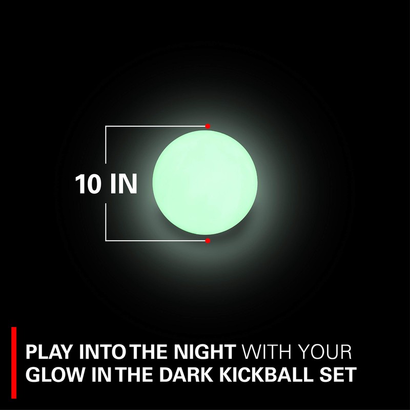 - TAKE IT ON THE ROAD: Perfect for family get togethers and sporting events. Compete with your family and friends for hours at a time. Play long in to the night now with our complete glow in the dark kickball set! It will be the talk of the party and you won’t have to worry about any stray kicks with the rubber kickball.