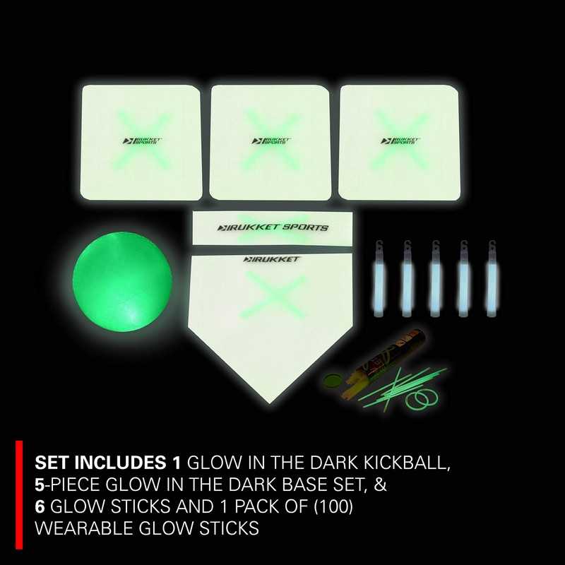 - NEW PRODUCT LAUNCH SALE - PLAY YOUR FAVORITE GAME INTO THE NIGHT: Portable and incredibly easy to set up. Play in your backyard or basement and now late into the night with our glow in the dark kickball set! This bundle includes: 4-Piece Glow In The Dark Rubber Throw Down Plates and Pitching Mound, (1) Glow In The Dark 10” Regulation Kickball, (6) Glow Sticks, and Ball Pump. This product is deeply discounted for a limited time. Add to cart now!