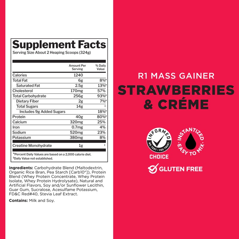 - ACCELERATED GAINS - With over 1,220 calories, more than 250g carbohydrates, and 40g protein from three types of whey, R1 Mass Gainer puts you in charge of transforming to XXL.