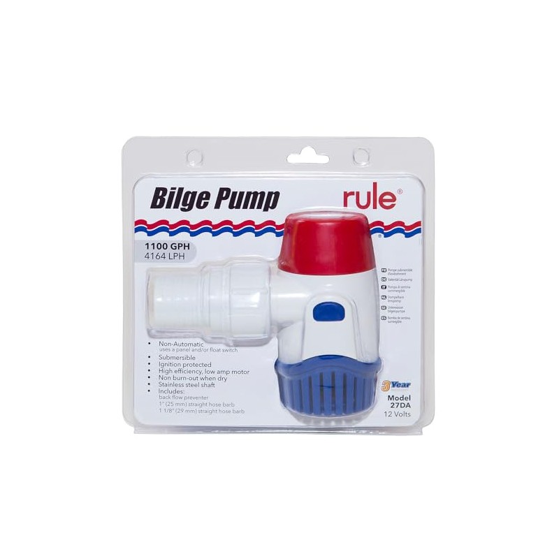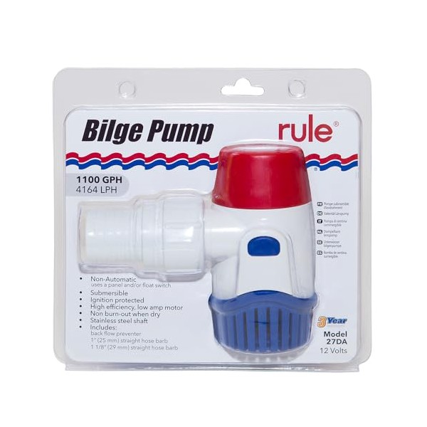 Rule Standard Bilge Pump 27DA - Not Automatic, Submersible, Marine Bilge Pump for Boats with Thermal Cut-Off, Check Valve, Low Amperage, 3/4" Threaded Ports, Ideal Boat Accessories - 1100 GPH, 12V