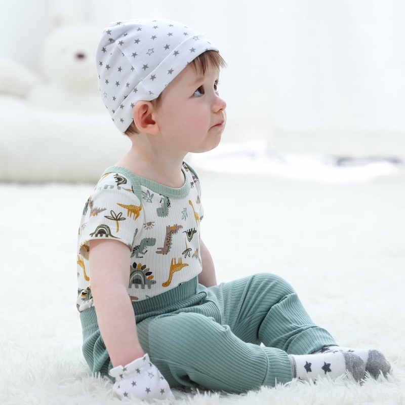 - Bodysuit and Pants Set Design 1: Bodysuit has three metal snap buttons at the bottom for easy changing. The pants have elastic and shrinkable cuffs for easy play